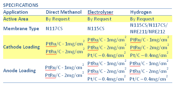 DuPontās Membrane Electrode Assemblies (MEAs) are available for Direct Methanol (DM) applications in a 3 layer configuration (MEA3), with appropriate Electrodes on each side of optimised Nafion PFSA Membrane. Sandwiched between two pieces of black carbon paper, the Nafion membrane forms the main reaction site. The MEA functions like a simple battery cell. Stacks of MEA are connected by the graphite bipolar plates. A fuel cell stack is a stack of MEA (cell) connected in series with graphite bipolar plates in between. MEA3 is fabricated to specific fuel cell operational and dimensional requirements based on customerās provided details of the dimensions. GasHub is the authorised dealer for DuPontās MEAs.